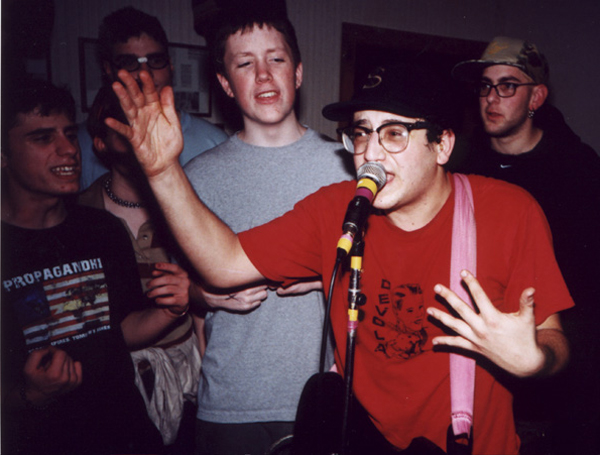 the opening act is a solo accoustic guitarist from a nearby city. he intros his songs in german but sings in near perfect english, which i find really irritating. i wish non english bands would sing in their own tongue more often. he introed a song and the only words i could make out were "palastine" and "gaza". i told atom this and his ears pricked up. the chorus was "rise up palastine" or something like that. atom booed at the end of the song. the highlight of accoustic dude's set was a weakerthans cover. atom used the palastine situation as an example of bandwagon jumping in his set to into a song -- "anarchy means i litter" i think. after the show dude came up to explain his german intro saying how in his intro he was saying the same thing as atom. still the song was pro-palastine.